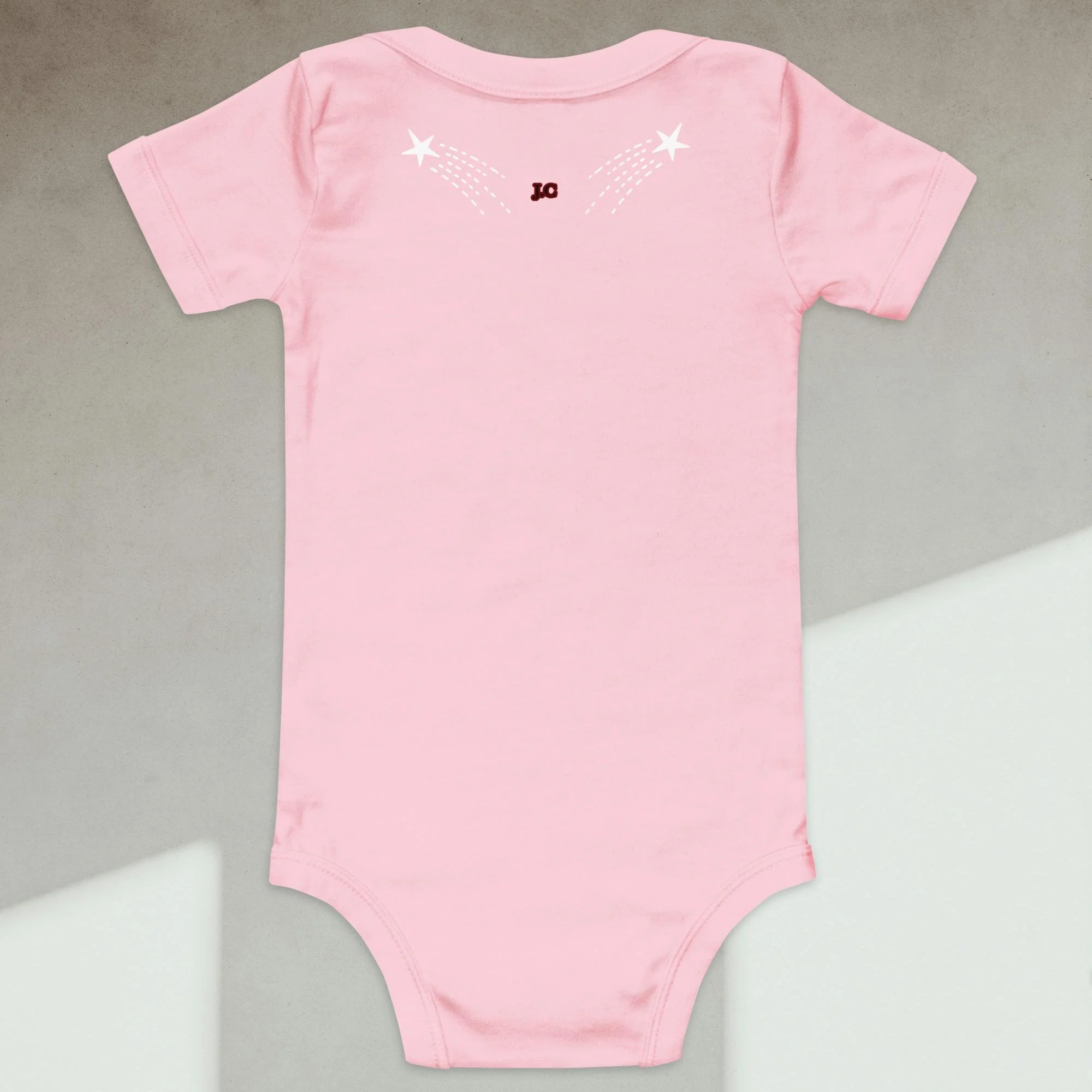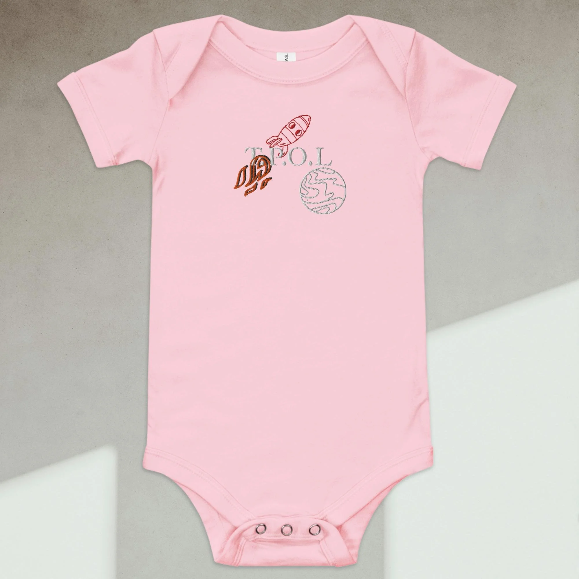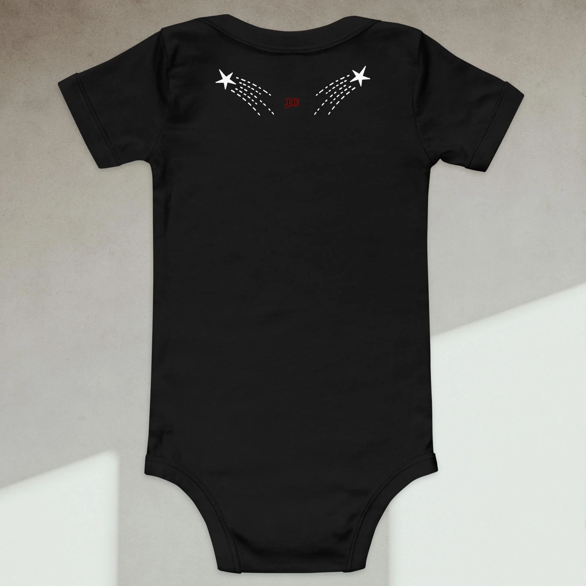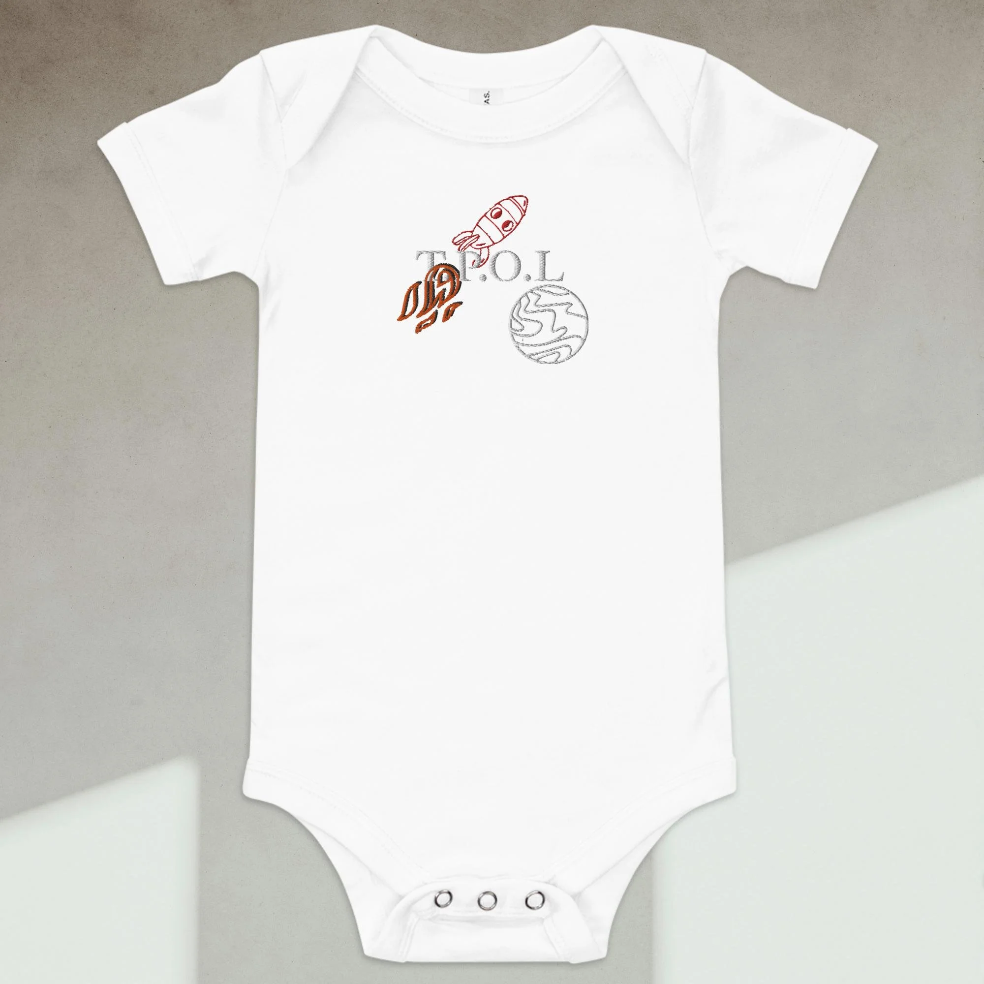 Dress your baby boy to the nines with this embroidered spaceship, 100% cotton one piece. It has three snap leg closure for easy changing, a comfortable envelope neckline, and a beautiful print that's bound to get the baby all happy and giggling, embroidered also with the Initials “J.C.“ A.K.A…Jesus Christ. The Lord and Savior.