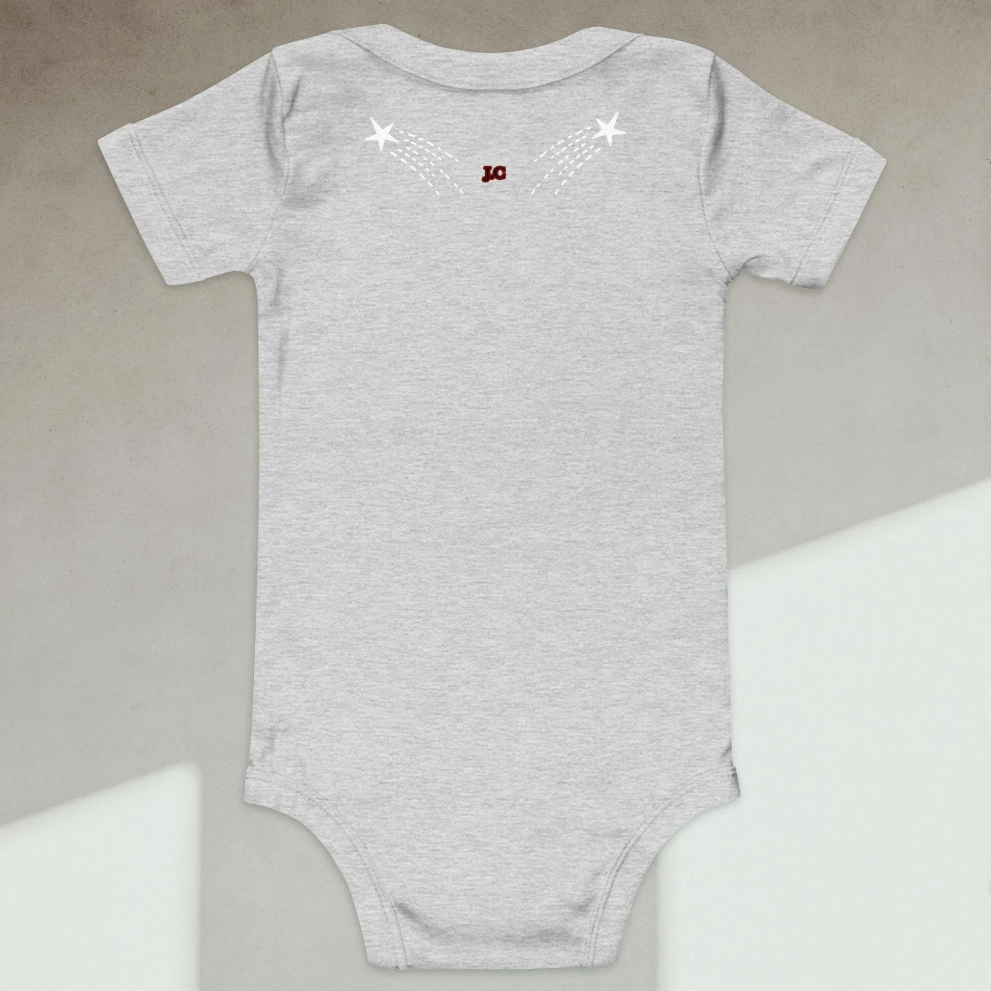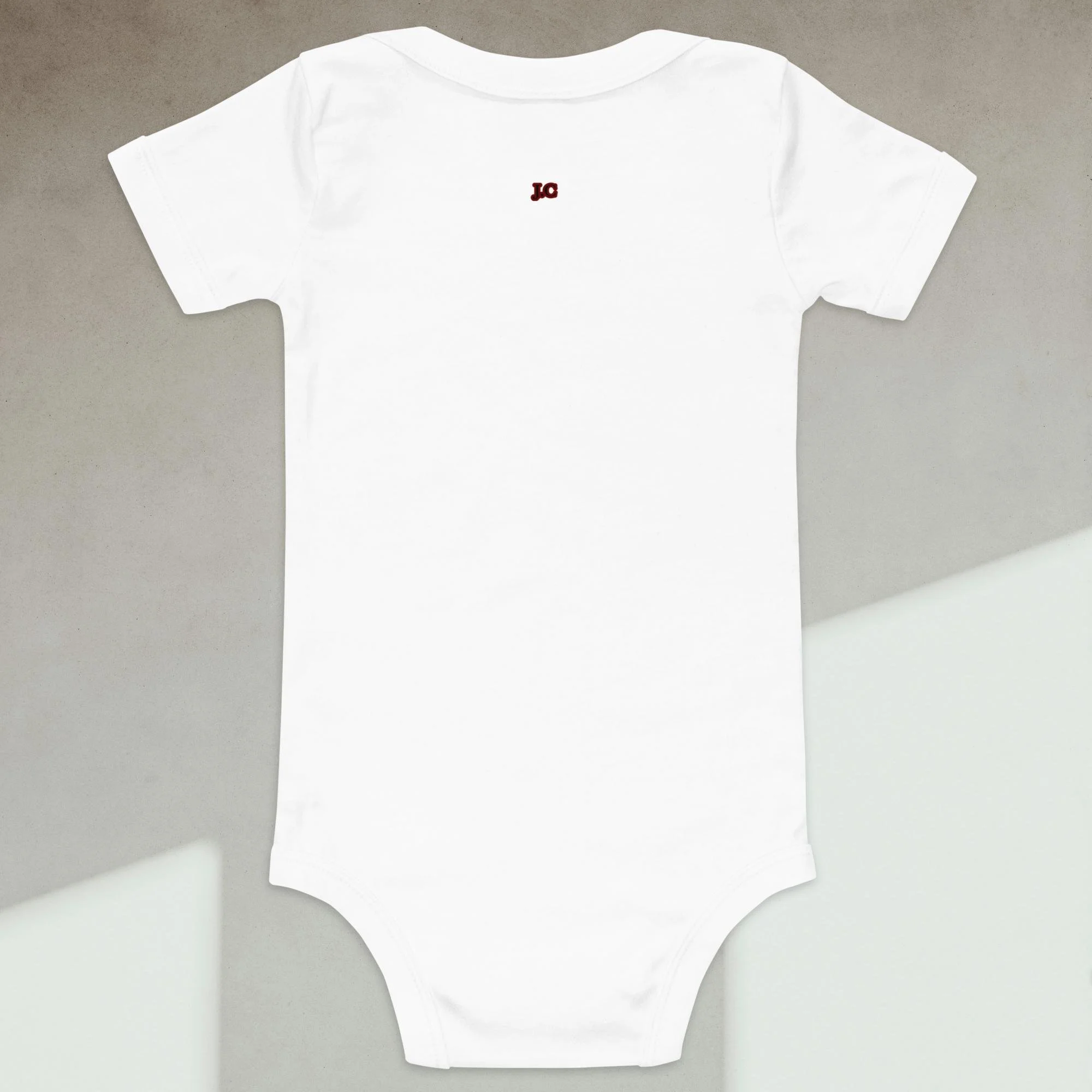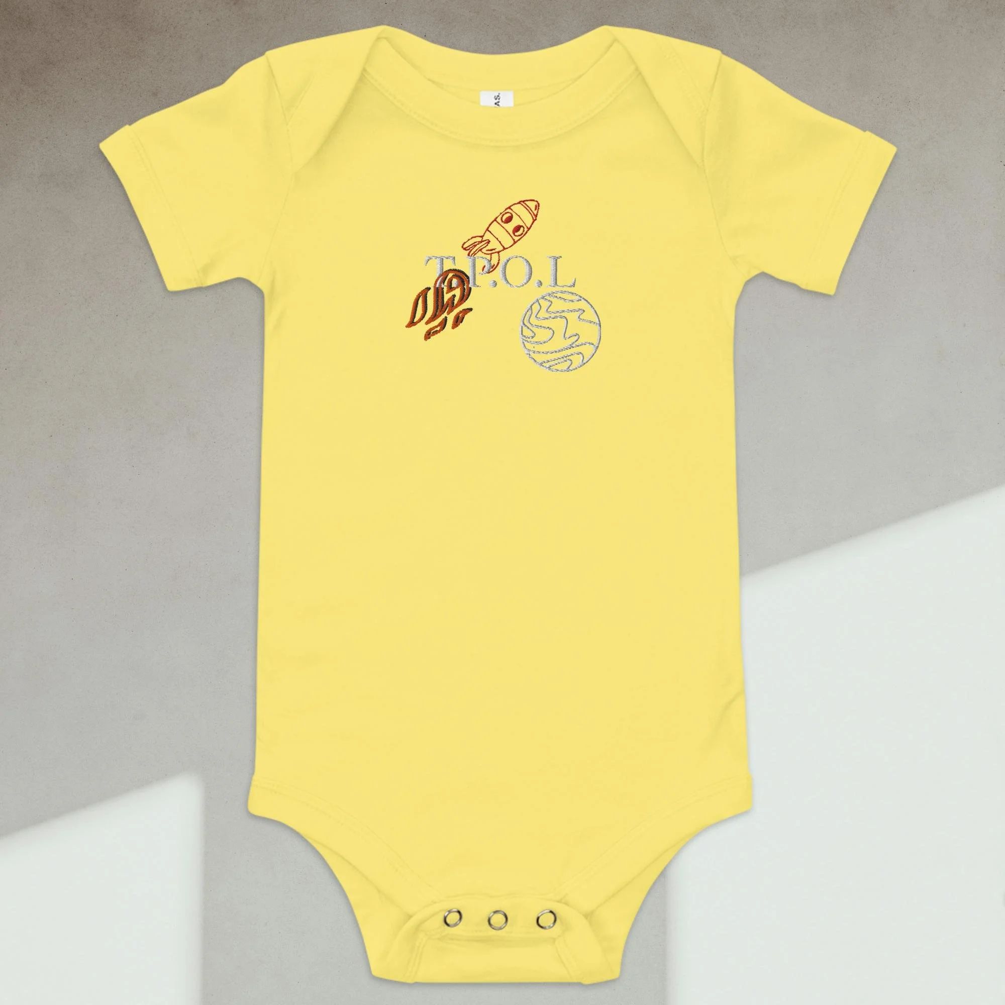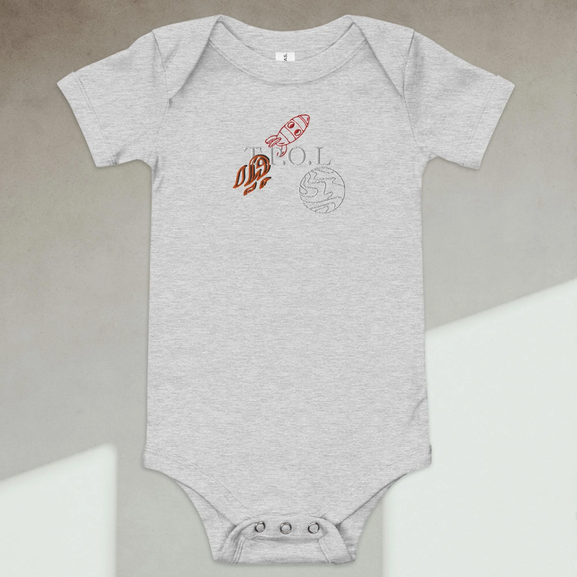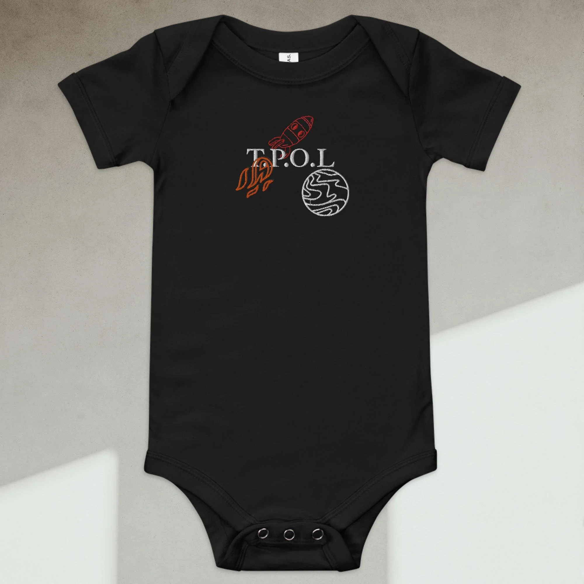 Dress your baby boy to the nines with this embroidered spaceship, 100% cotton one piece. It has three snap leg closure for easy changing, a comfortable envelope neckline, and a beautiful print that's bound to get the baby all happy and giggling, embroidered also with the Initials “J.C.“ A.K.A…Jesus Christ. The Lord and Savior.