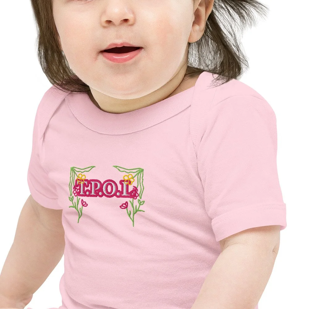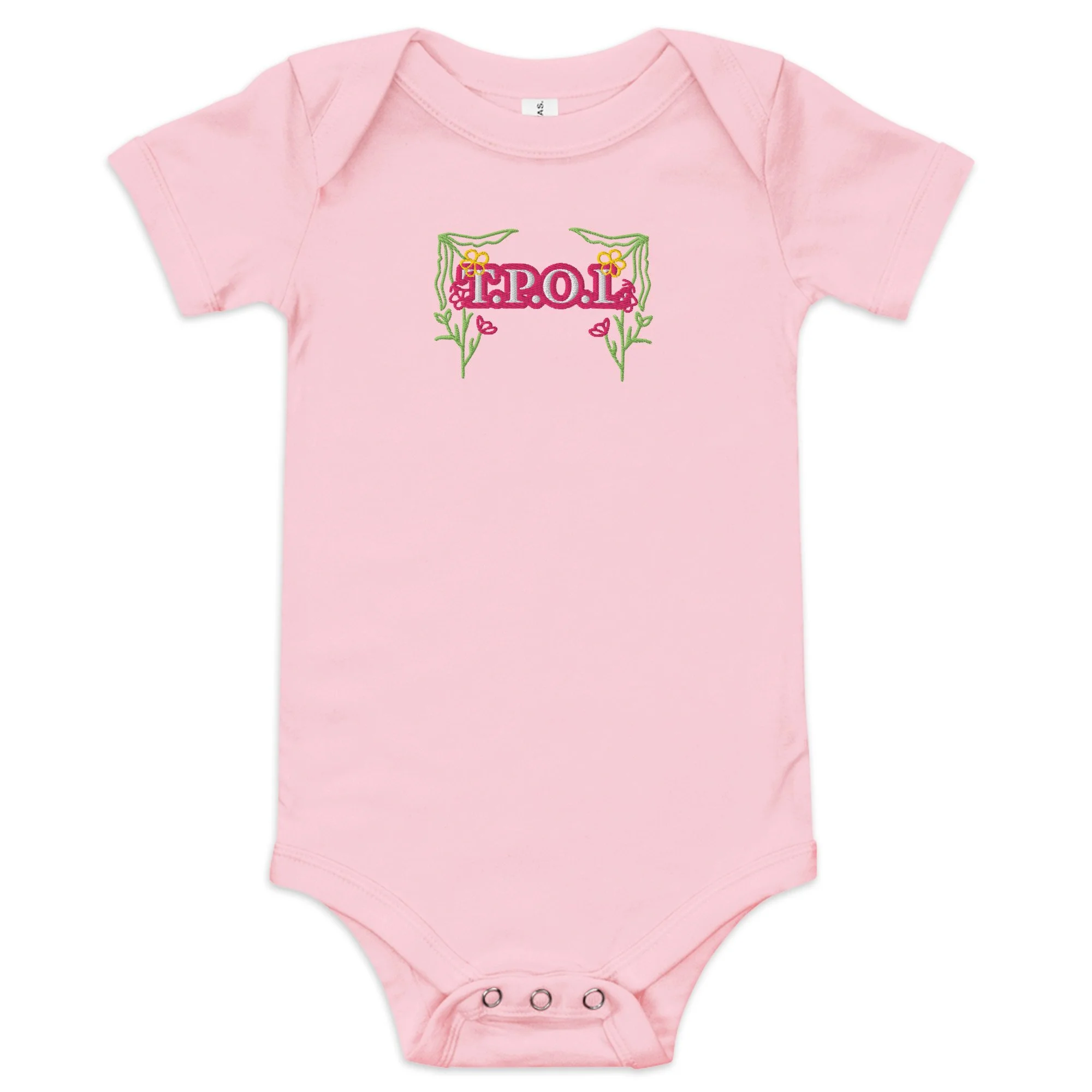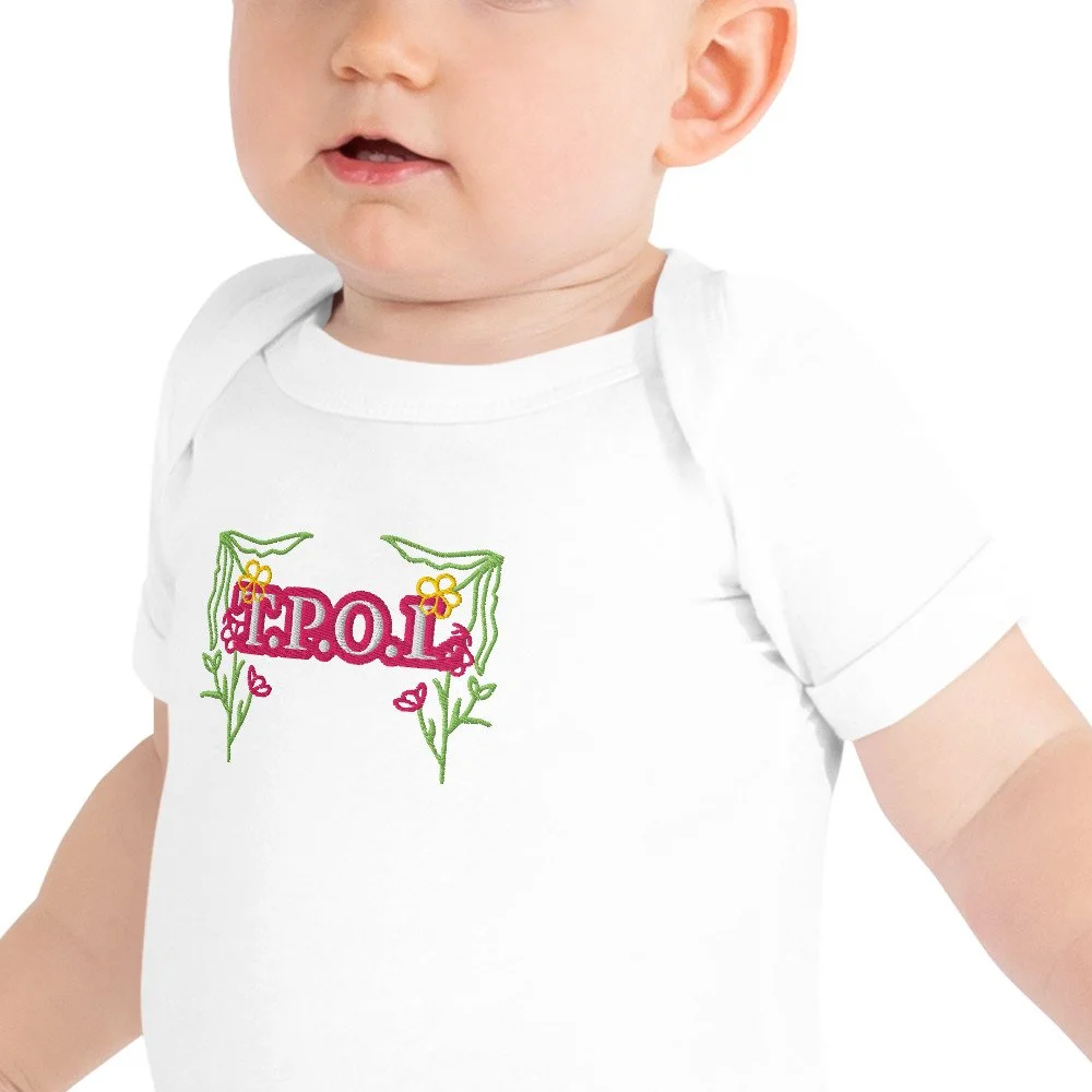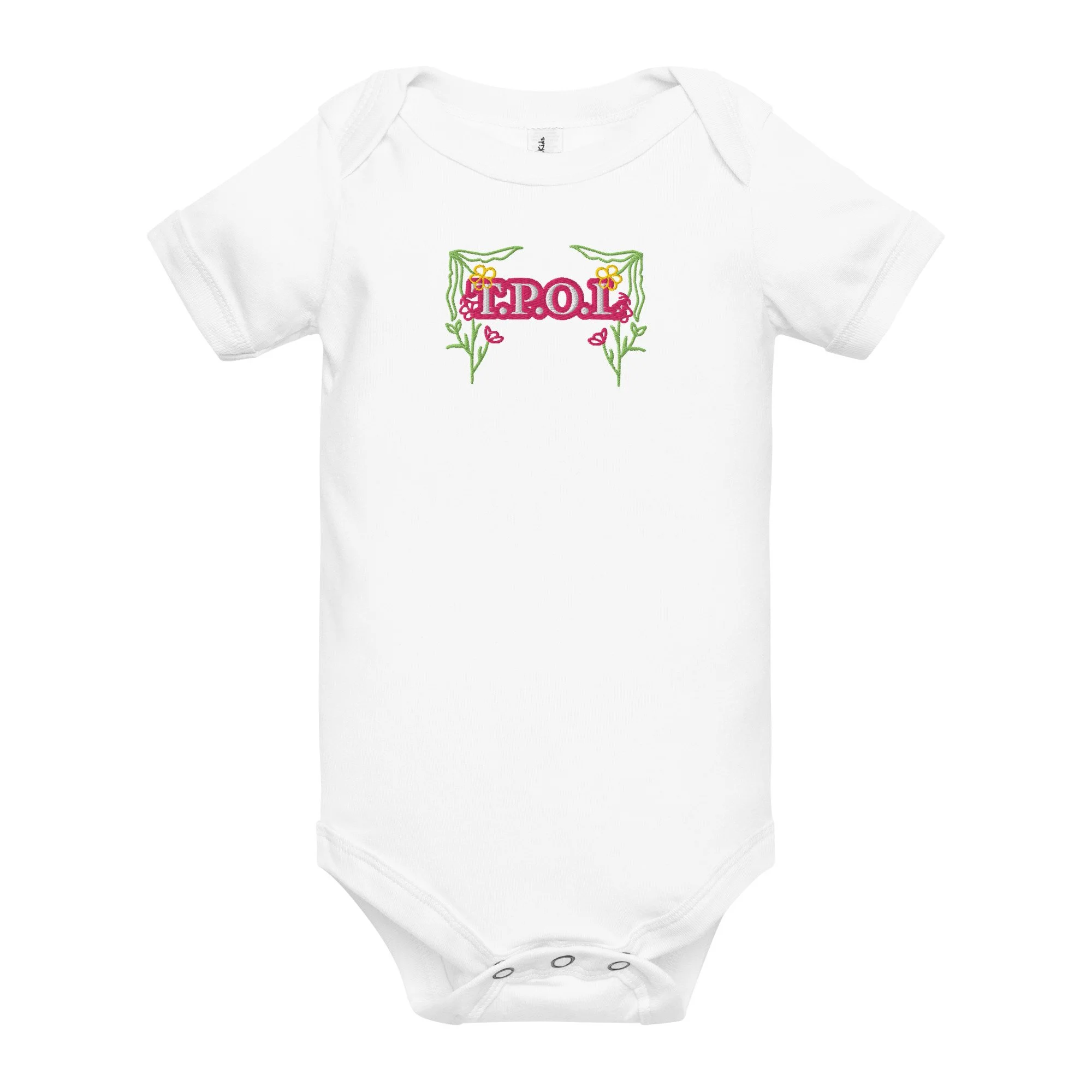 Dress your baby girl to the nines with this adorable floral embroidery, 100% cotton one piece. It has three snap leg closure for easy changing, a comfortable envelope neckline, and a beautiful print that's bound to get the baby all happy and giggling, embroidered also with the Initials “J.C.“ A.K.A…Jesus Christ. The Lord and Savior.