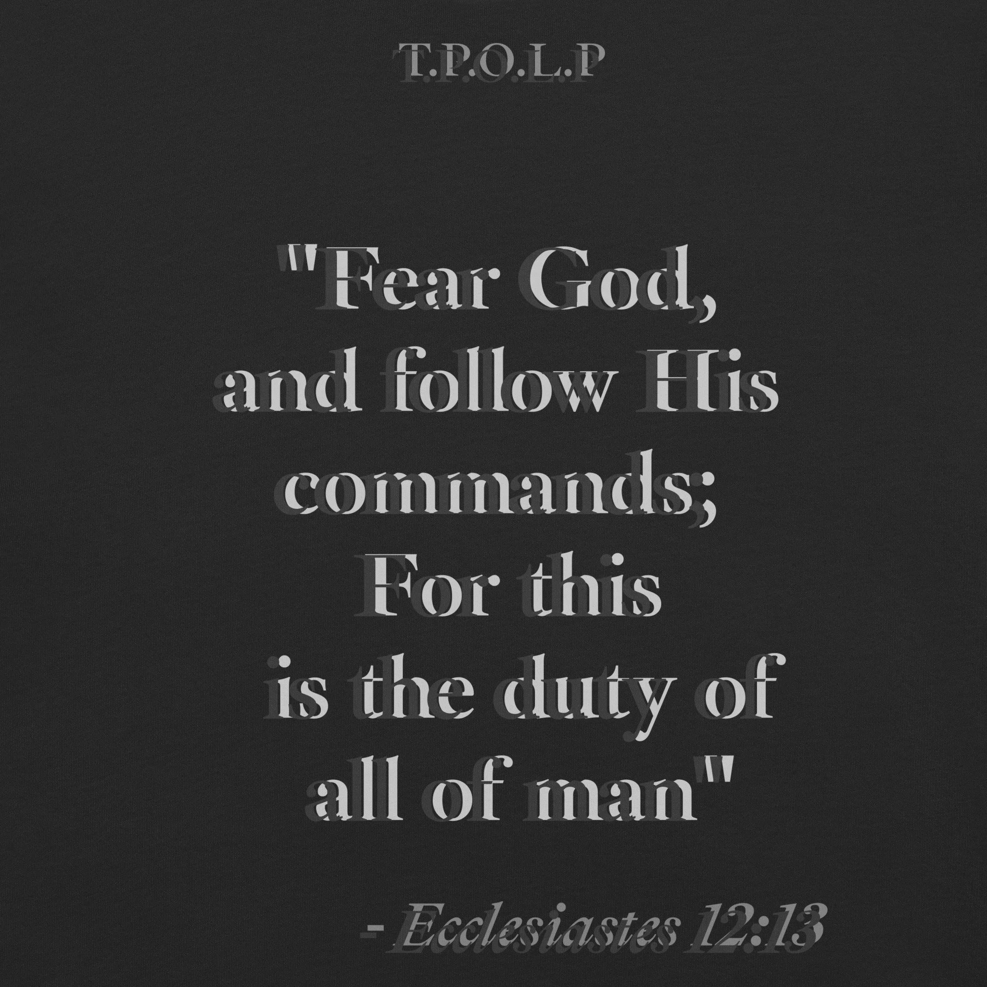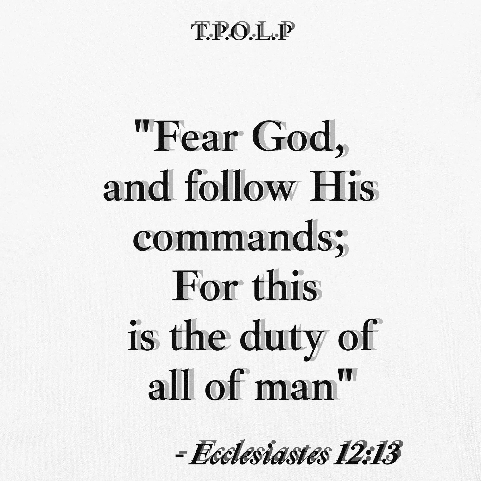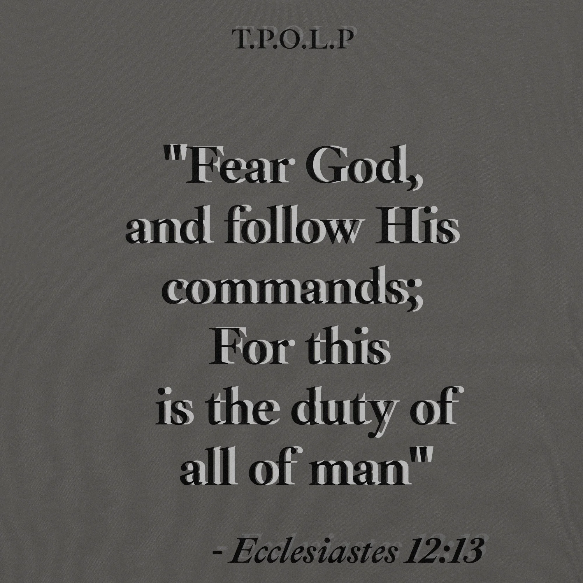 Take on your day in our comfy & breathable Ecclesiastes 12:13 cotton t-shirt. Rock this tee with our 'T.P.O.L.P' wide-leg sweatpants & matching socks. You could even layer with a matching Ecclesiastes Hoodie! This regular t-shirt style will compliment most looks, and fit you to a tee. Even better, all while sharing the Word of God, and supportingg a humble Christian Business!