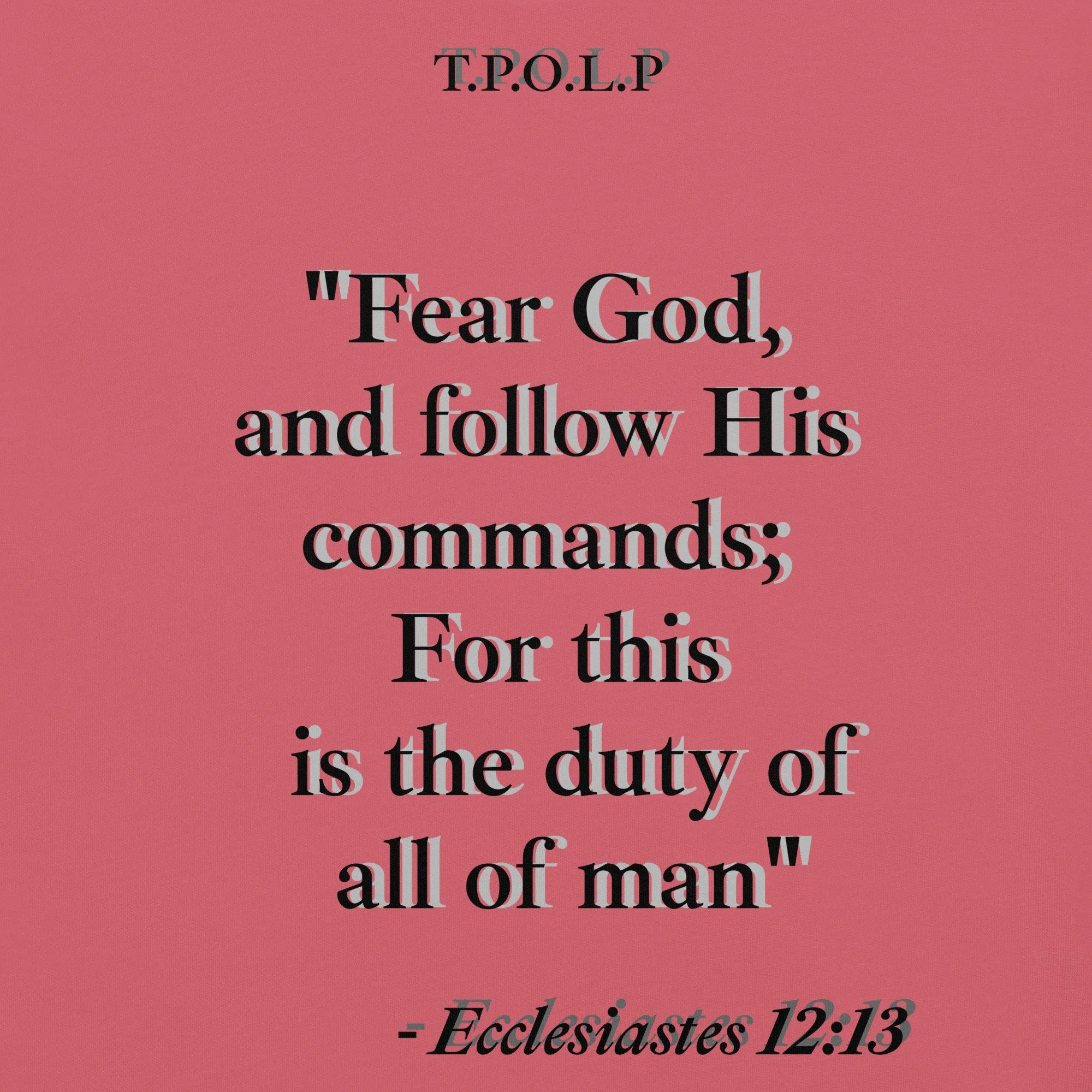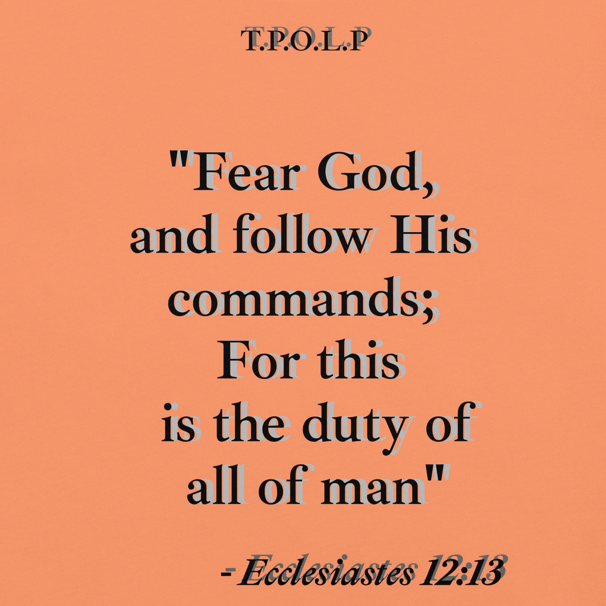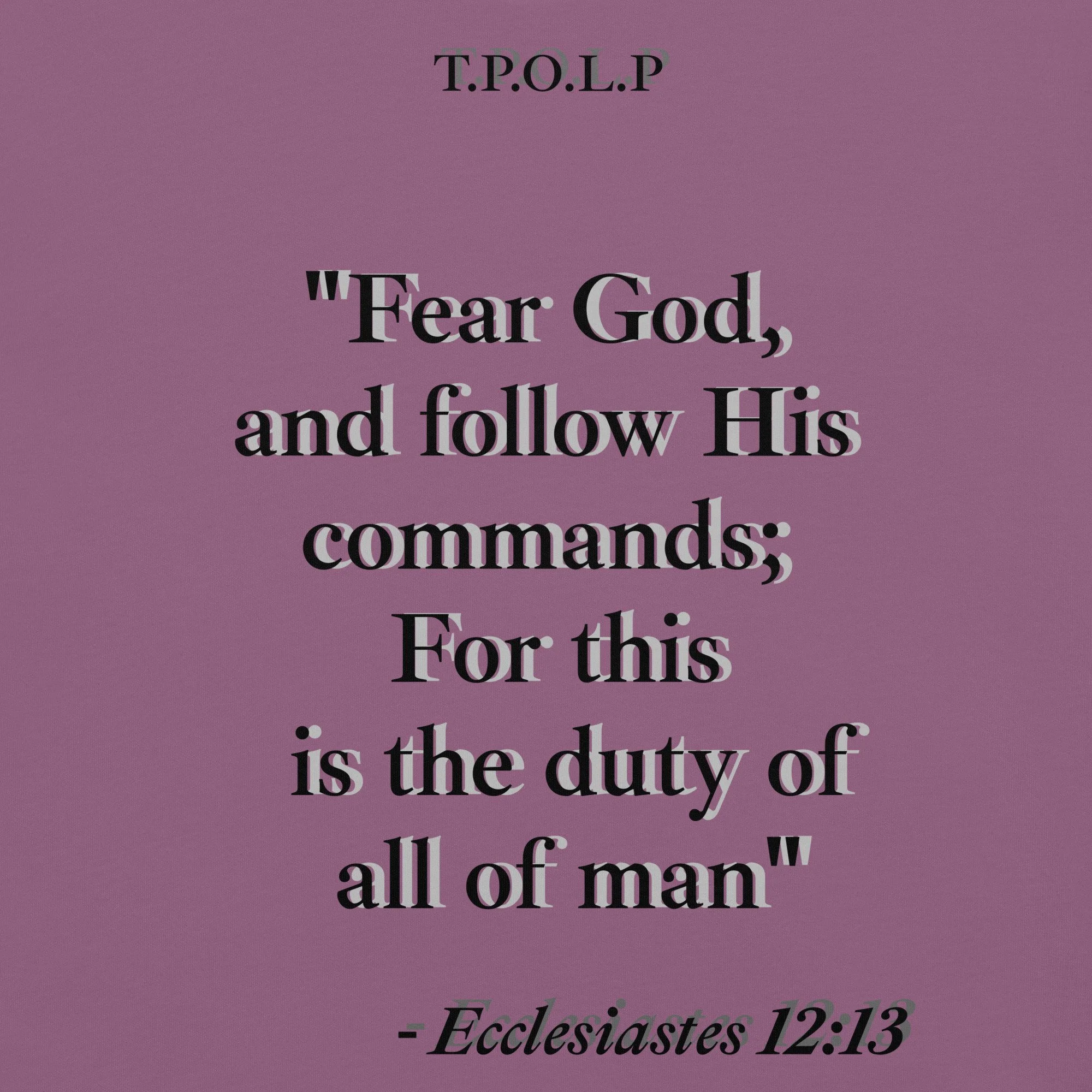 Take on your day in our comfy & breathable Ecclesiastes 12:13 cotton t-shirt. Rock this tee with our 'T.P.O.L.P' wide-leg sweatpants & matching socks. You could even layer with a matching Ecclesiastes Hoodie! This regular t-shirt style will compliment most looks, and fit you to a tee. Even better, all while sharing the Word of God, and supportingg a humble Christian Business!